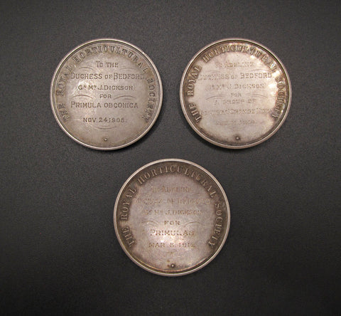 - 3 x 38mm Royal Horticultural Society silver medals, for 1908, 1910 & 1912, awarded to Adeline, The Duchess of Bedford, grower Mr J. Dickson.