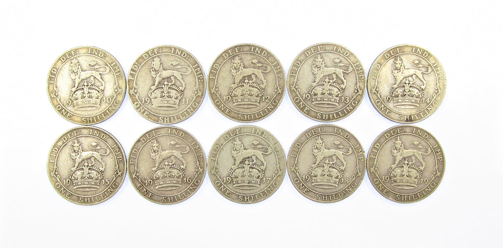 Full date run of 10 silver Shillings from 1910 to 1919.