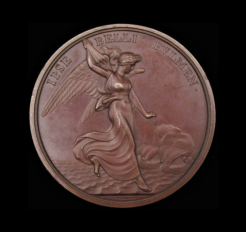 Obverse with bare head of Nelson, reverse with Bellona, thunderbolts in hand, approaching war galleys.