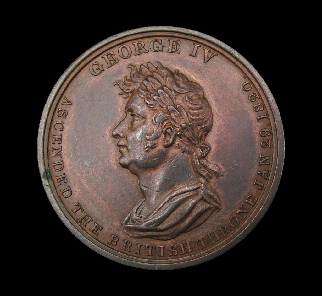 Obverse with laureate draped bust of George IV, reverse with crown, orb and sceptre upon cushion, within wreath.