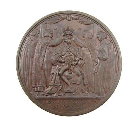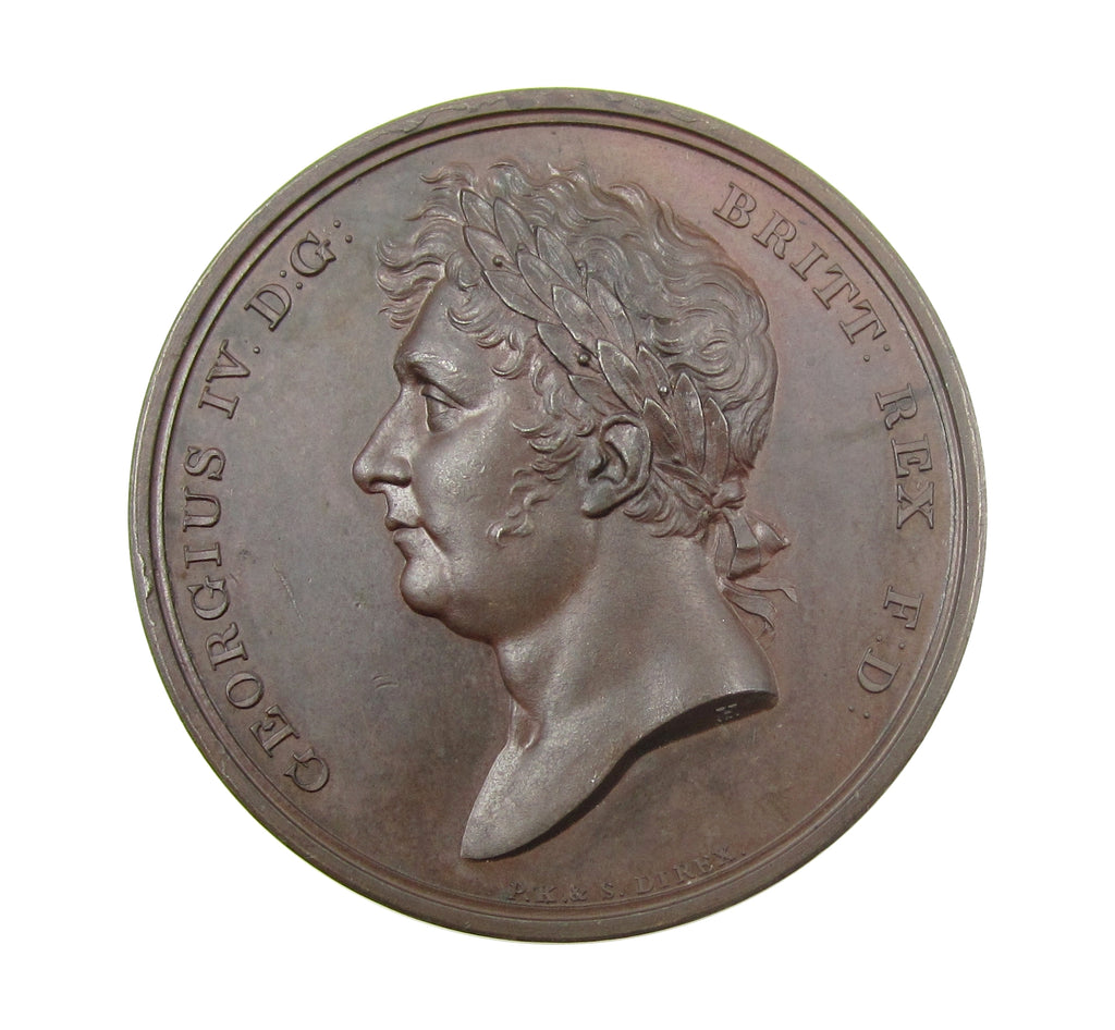 Obverse with laureate bust of George IV, reverse with enthroned figure of King being crowned.
