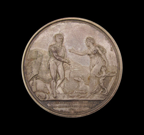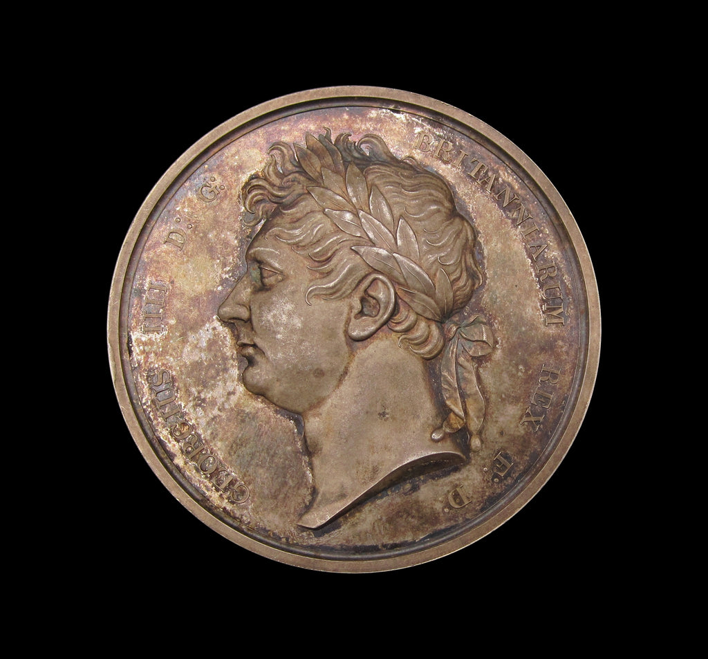 Obverse with laureate head of George IV, reverse with Hibernia standing on the shore welcoming the King as he disembarks from a boat. Edge engraved 'IRISH SILVER, FROM THE BALLY-CORUS MINE, COUNTY OF DUBLIN'.