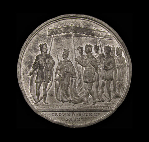 The Queen, holding orb and sceptre, leads a procession beneath a canopy, supported by courtiers.