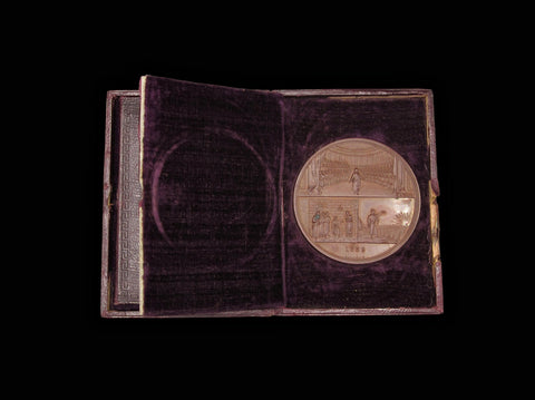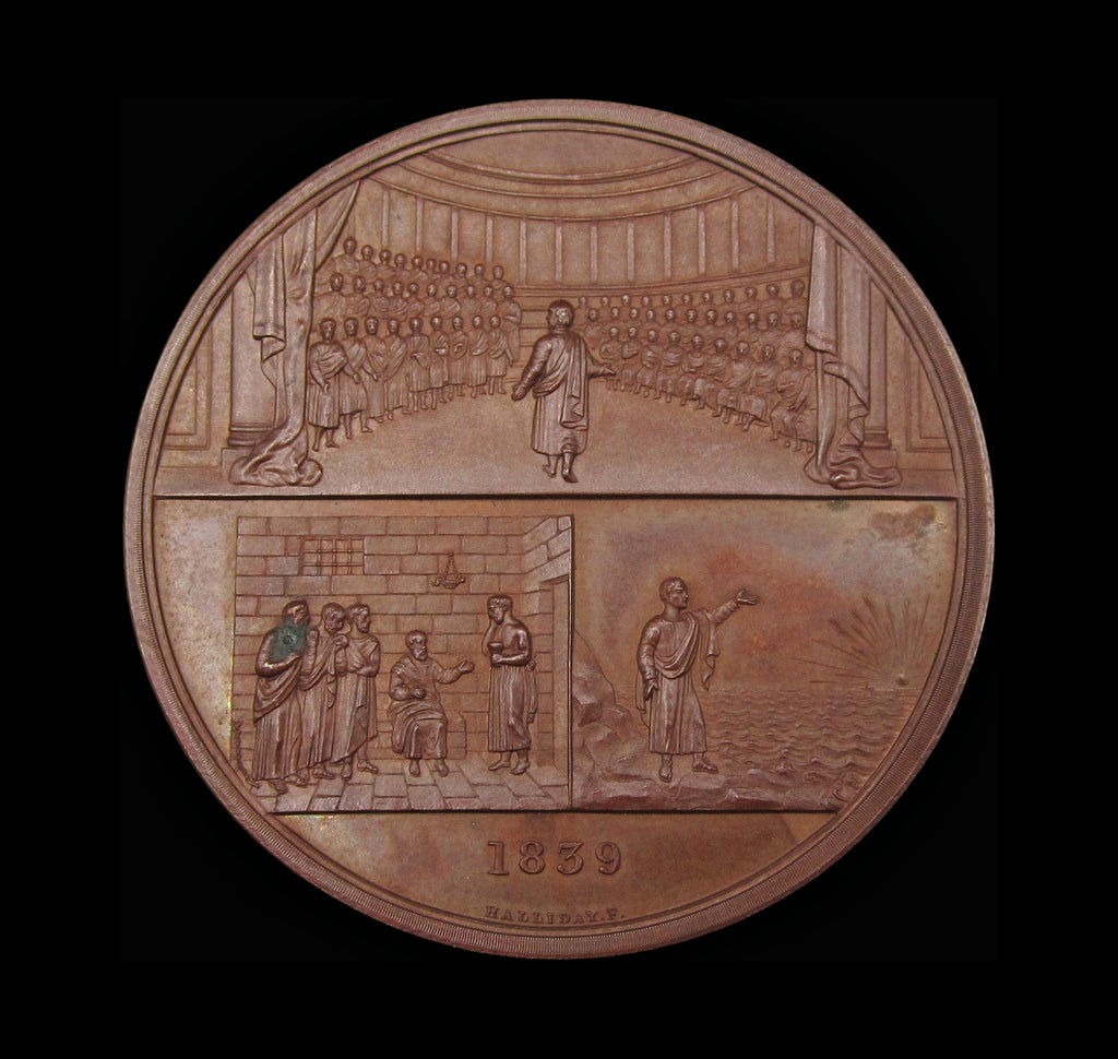 Obverse with images of the Theatre at Athens, with Spartans and Athenians, Socrates in prison below, and right, Demosthenes on a rocky shore. Reverse with legend and numbered 244 within tablet. Edge plain.