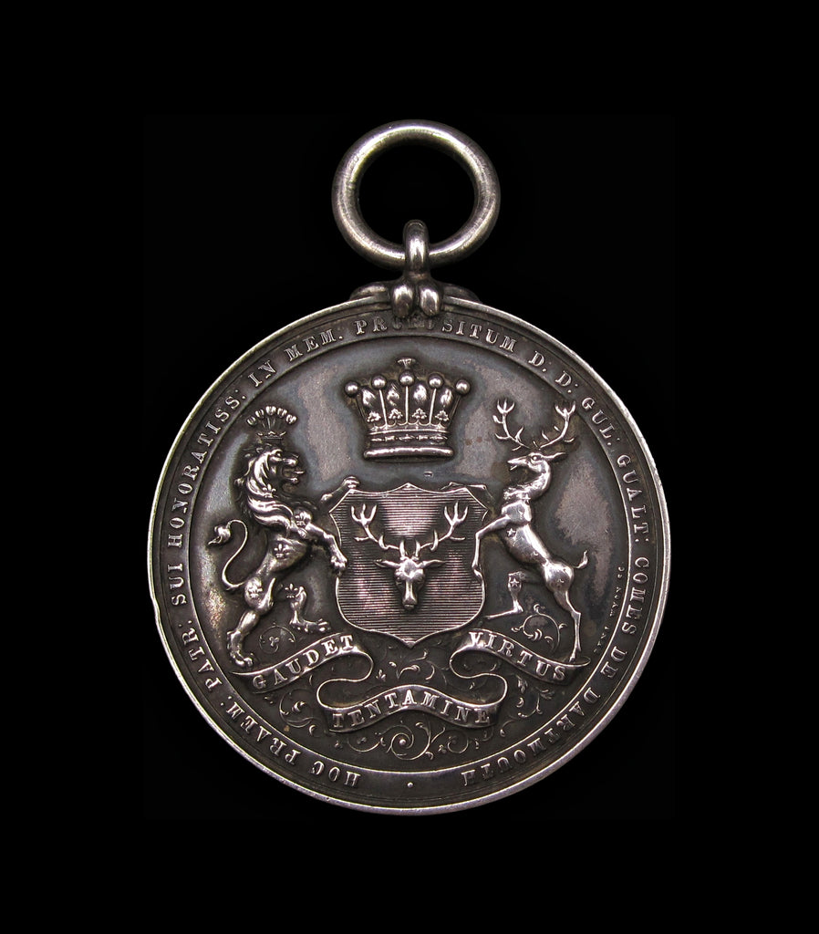 Colchester Royal Grammar School, the Earl of Dartmouth’s silver award medal. Obverse with arms of Dartmouth and supporters, reverse with legend in wreath and named to Alberto Broughton. Edge engraved MDCCCLXVIII.