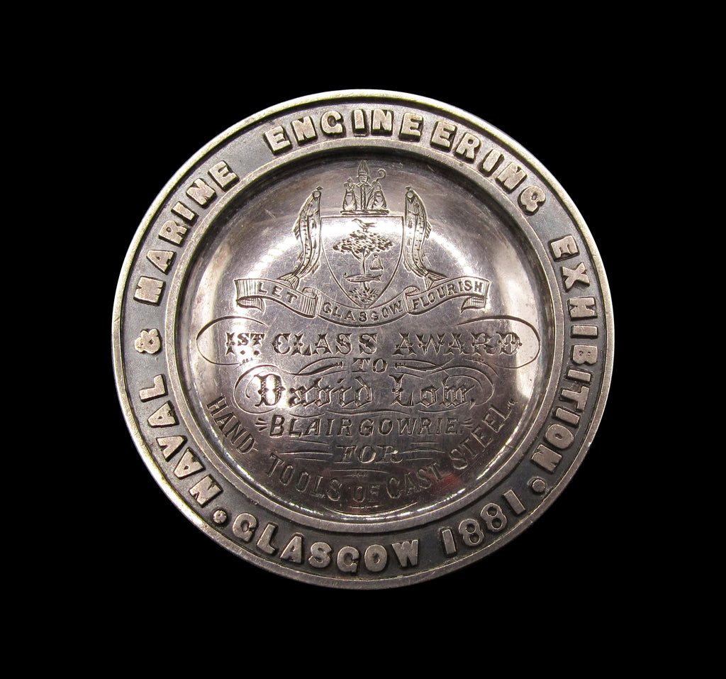Obverse with coat of arms and engraved '1st Class Award To David Low - Blairgowie - For - Hand Tools of Cast Steel'. Reverse plain within decorative border.