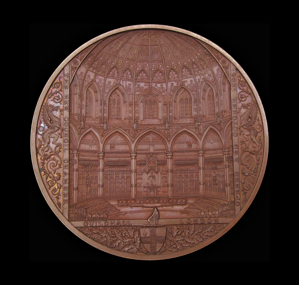 A detailed interior view of the council chamber, flanked by two heraldic panels. From the Corporation of London series.