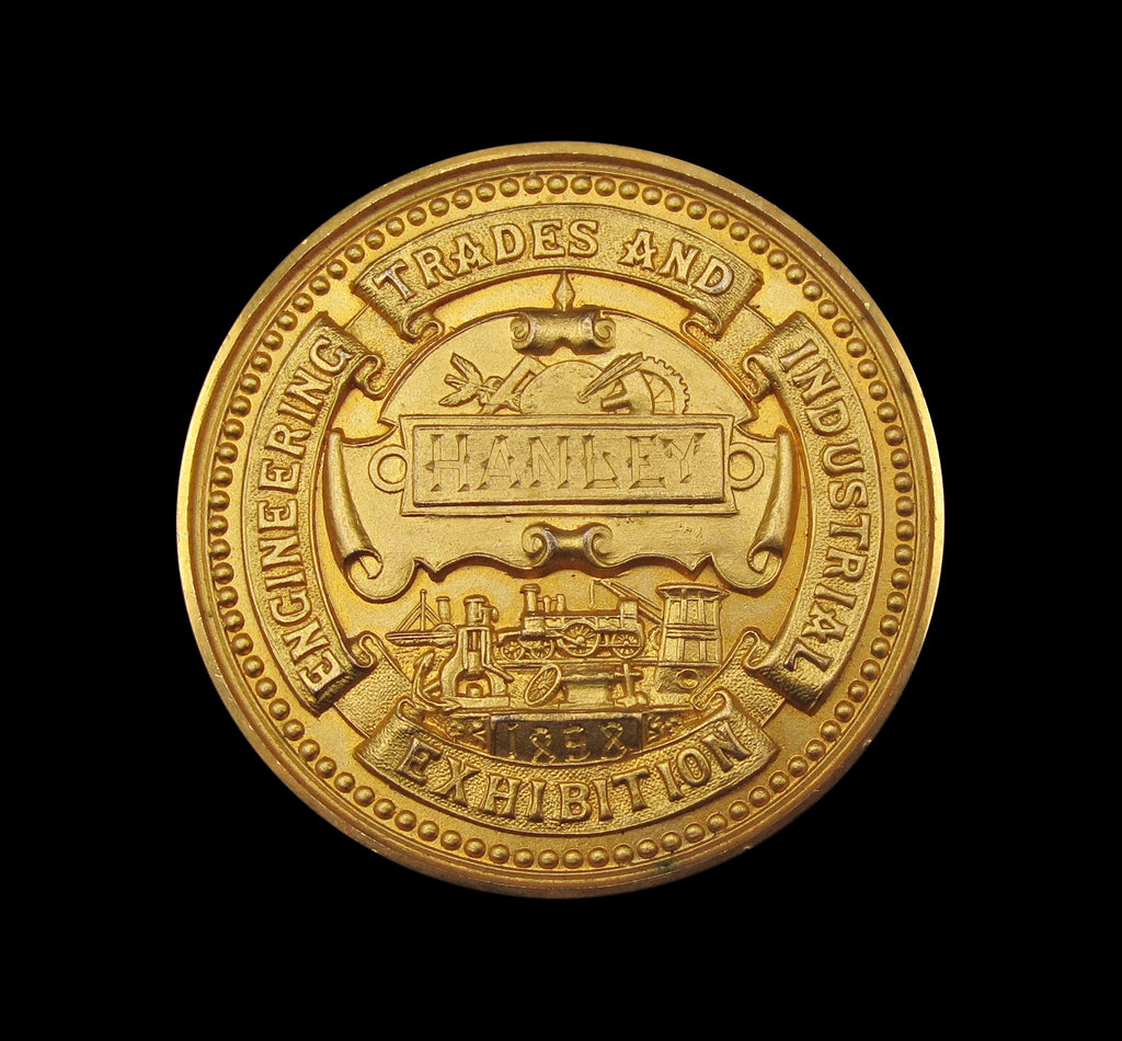 Obverse with items of industry, tablet engraved 'HANLEY', within ribbon border, reverse engraved within wreath 'Awarded To [sic] For Hygienic Bread & Confectionery'.