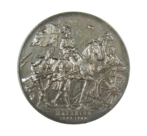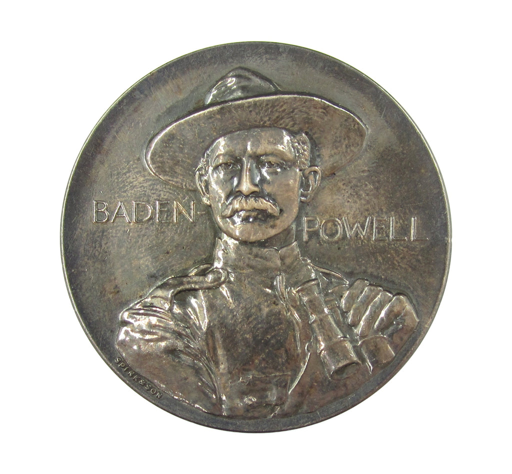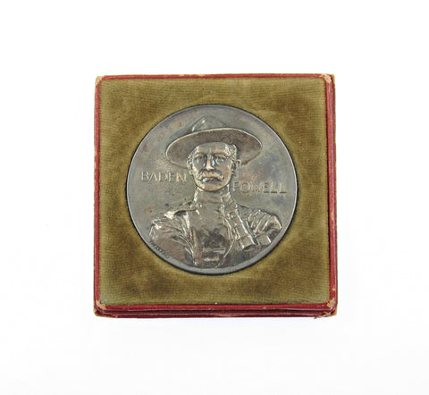 Obverse with uniformed bust of Lord Baden-Powell, reverse showing three British soldiers of the armed services advancing, greeted by a solider waving his hat.