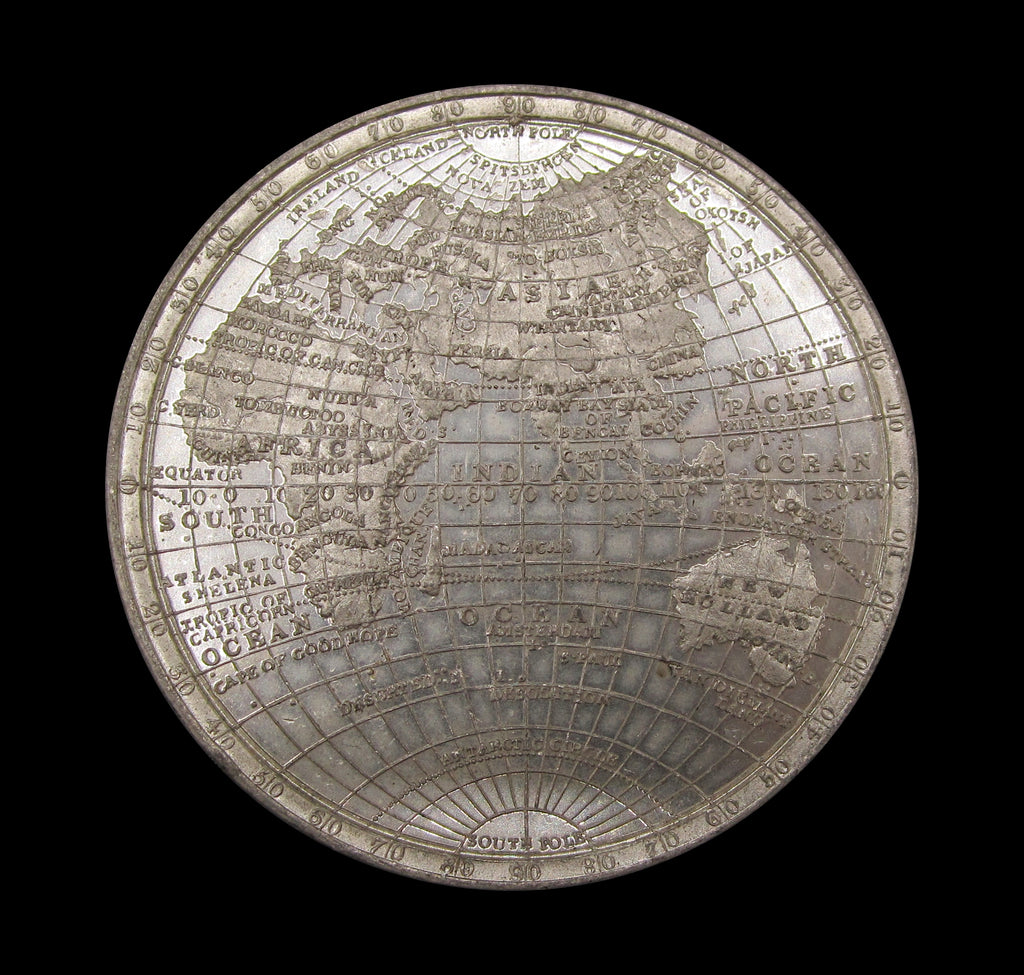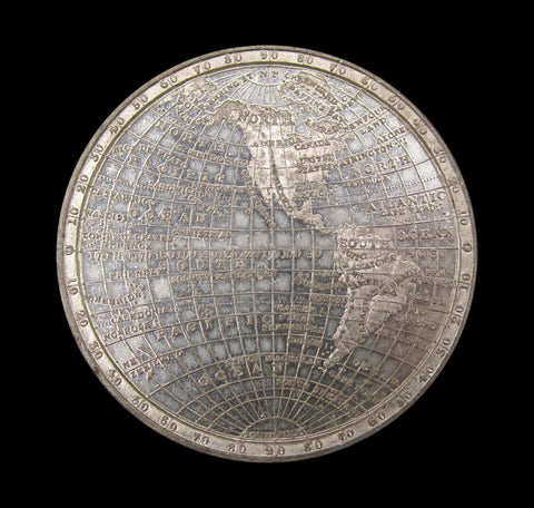A most impressive medal showing detailed maps of the Eastern and Western hemispheres.