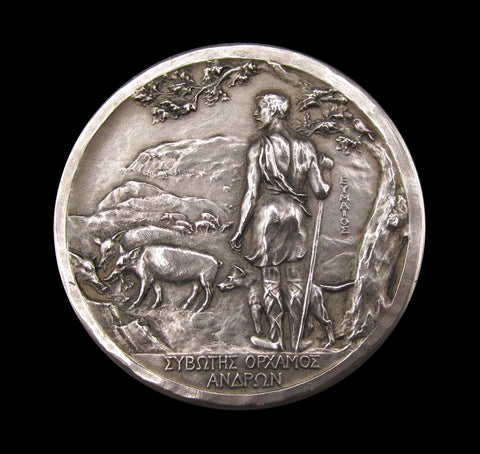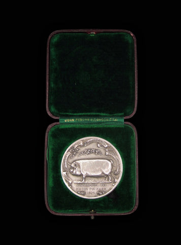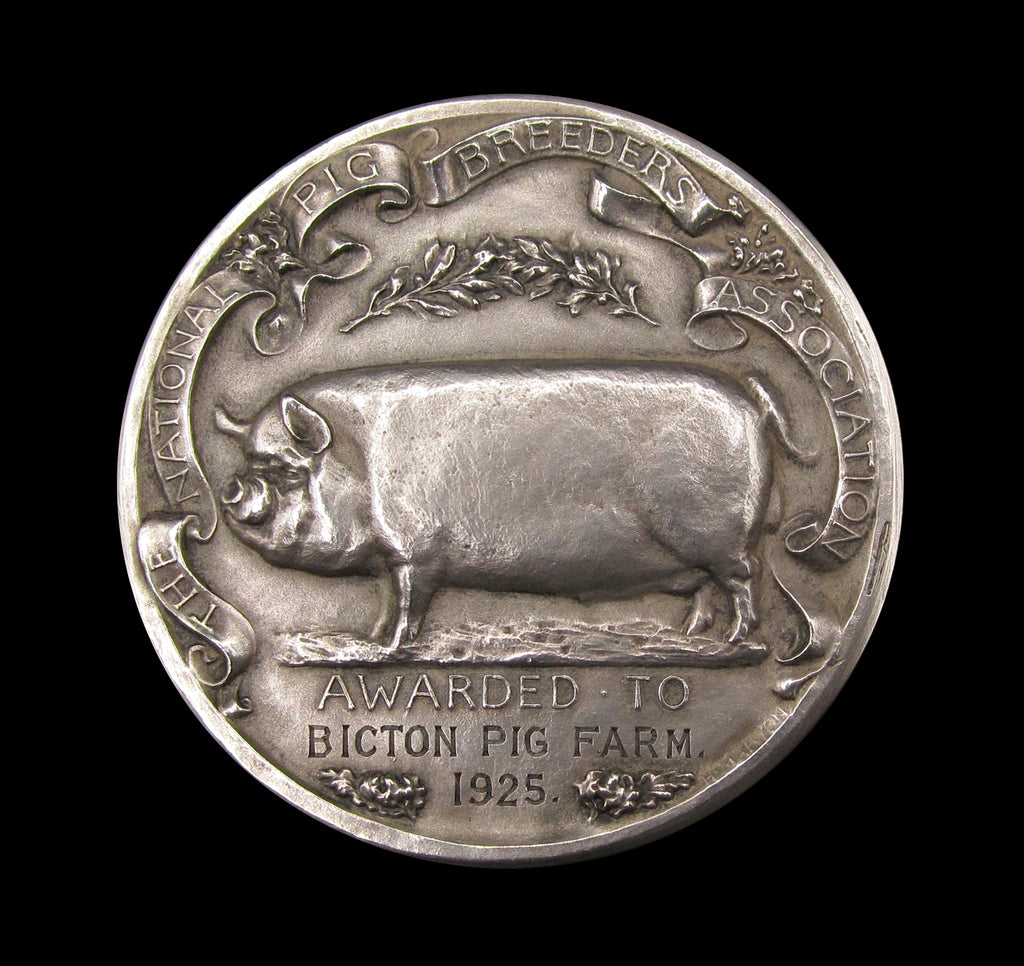 Obverse with a pig in side profile, reverse showing a Greek swineherd and his dog watch over many pigs. Awarded to Bicton Pig Farm - 1925.