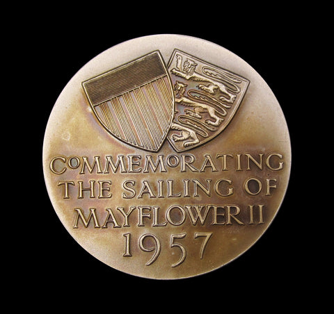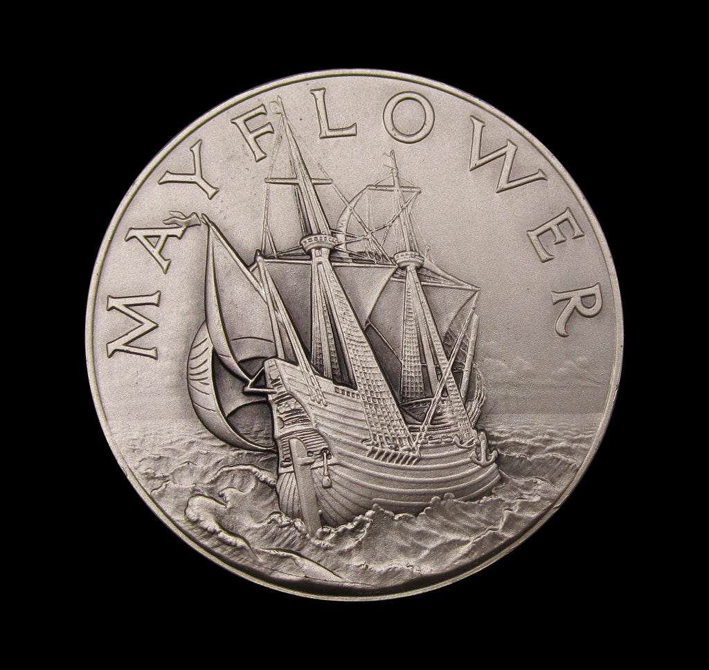 Obverse with view of the Mayflower, reverse with crossed shield and 4 line legend. Edge hallmarked and stamped with issue number of 20.