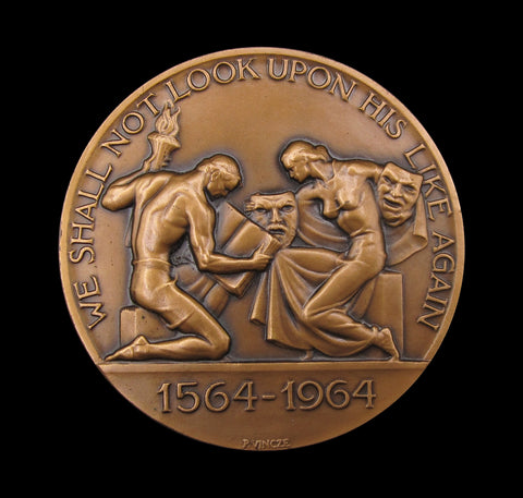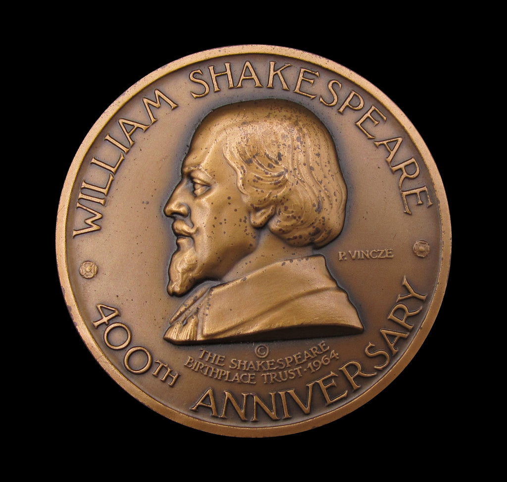 Obverse with draped bust of Shakespeare, reverse with a male and female figure holding open a book.