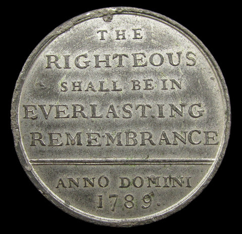 Obverse with bust of Reverend John Wesley, reverse with 'The Righteous Shall Be In Everlasting Remembrance' and Anno Domini 1789 within exergue.