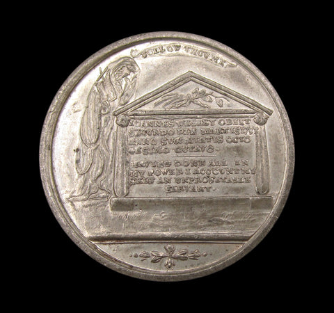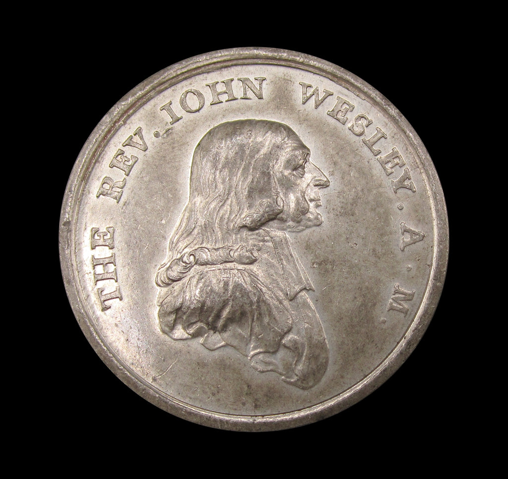 Obverse with bust of Reverend John Wesley, reverse with veiled figure standing mourning at inscribed tomb.