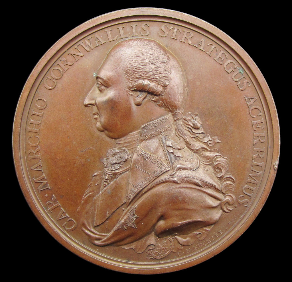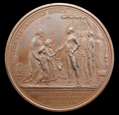 Obverse with draped bust of Cornwallis, reverse with Cornwallis, standing before his aides, receiving Sultan Tippoo who presents his two sons.