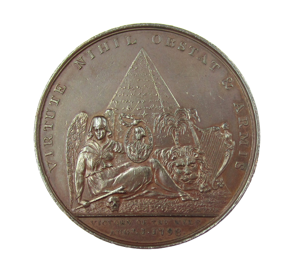 Obverse showing Victory holding a medallion of Nelson, seated before a pyramid. Reverse with a ribbon decorating a shield and anchor.