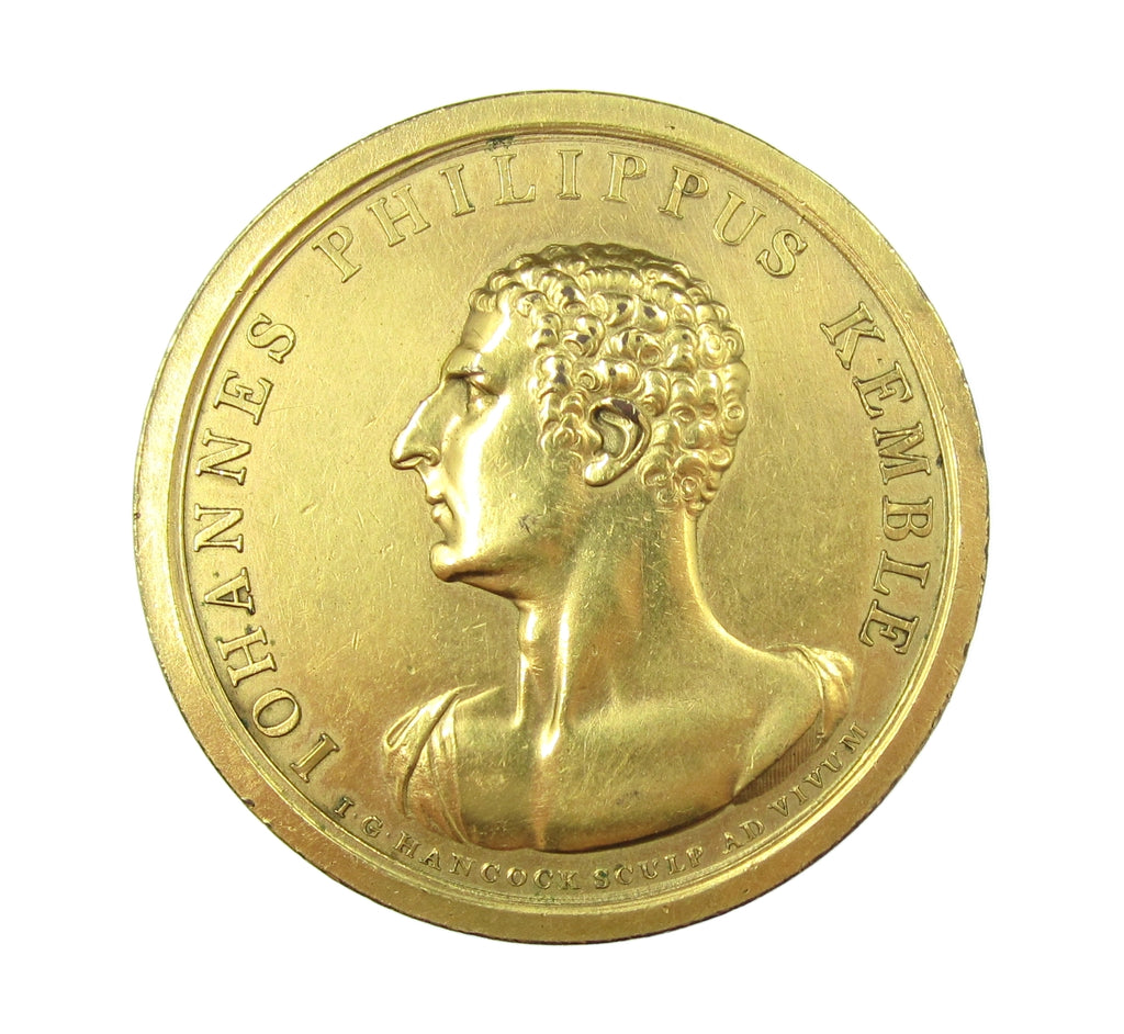 Obverse with bust of Kemble, reverse with legend within wreath, decorated with theatrical masks.