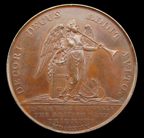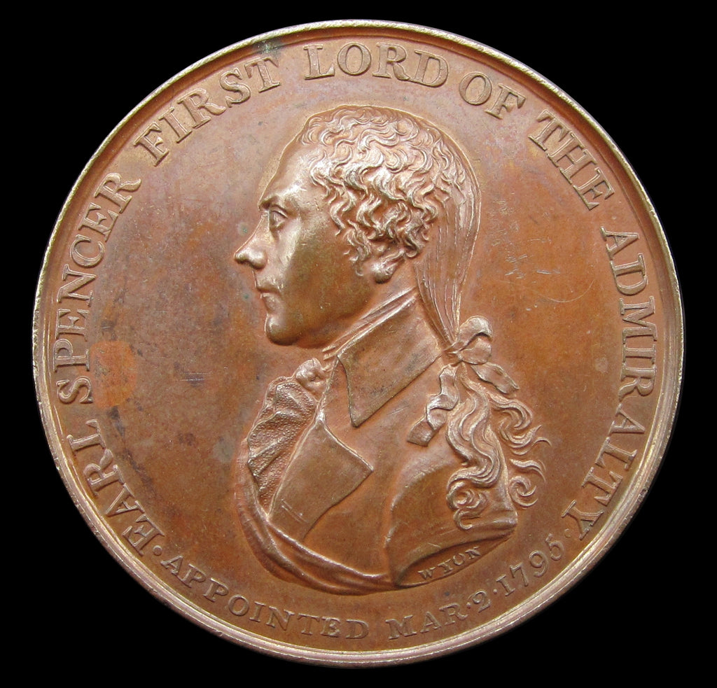 Obverse showing bust of Admiral Earl Spencer, reverse showing Fame standing beside an anchor and rudder.
