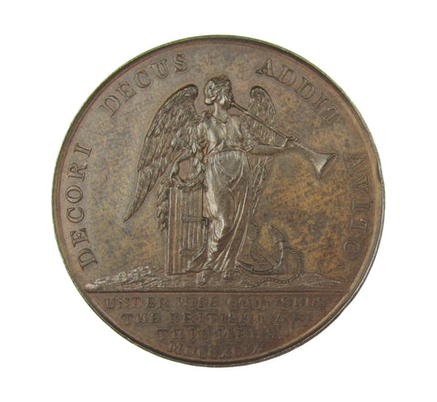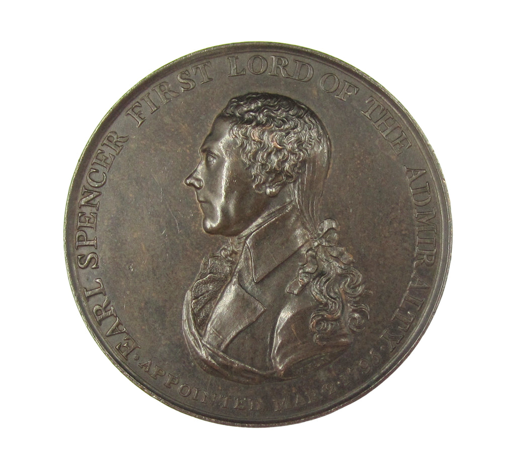 Obverse showing bust of Admiral Earl Spencer, reverse showing Fame standing beside an anchor and rudder.