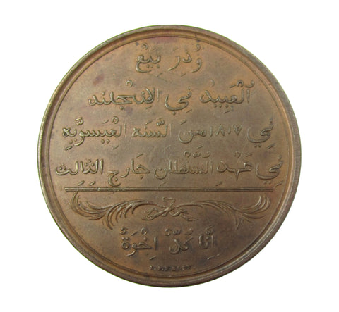 Obverse with two men facing each other, their hands clasped. Reverse with arabic inscription. Used for token currency in Sierra Leone.