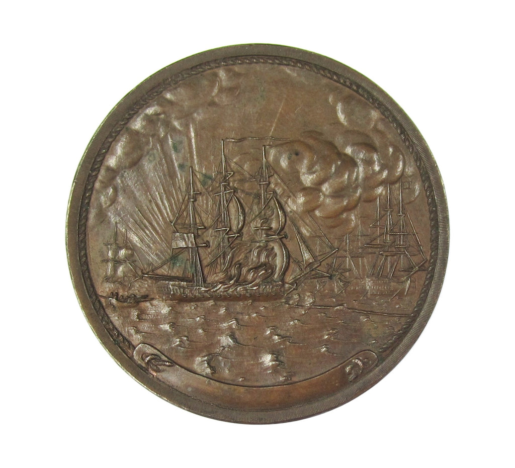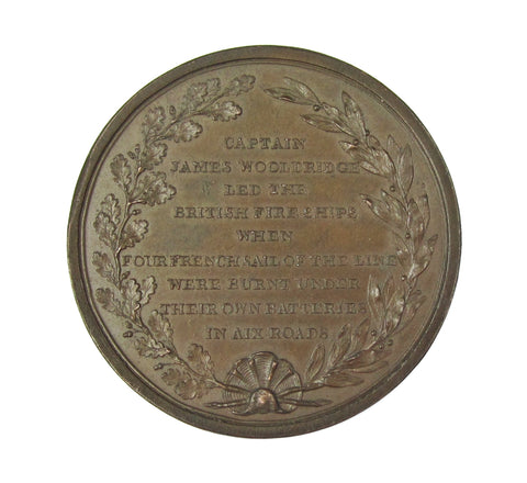 Obverse with fireships approaching the French fleet, reverse with 9 line inscription within wreath. Captain Wooldridge received a gold example of this medal, affixed to a chain.