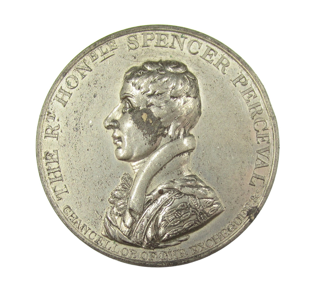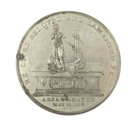 Obverse with laureate and draped bust of Spencer Perceval, reverse with a tomb depicting an assassination scene.