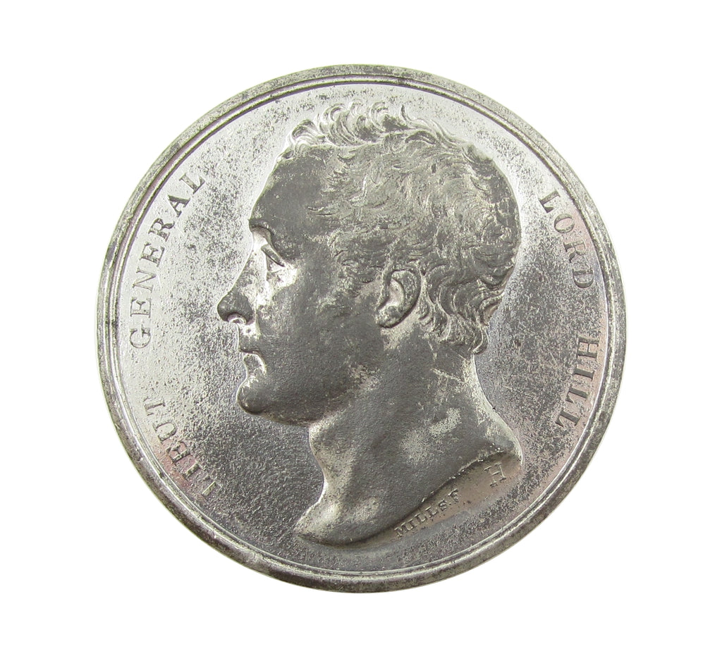 Obverse with bare head of Lord Hill, reverse with Victory and Bellona flying over destroyed bridge.