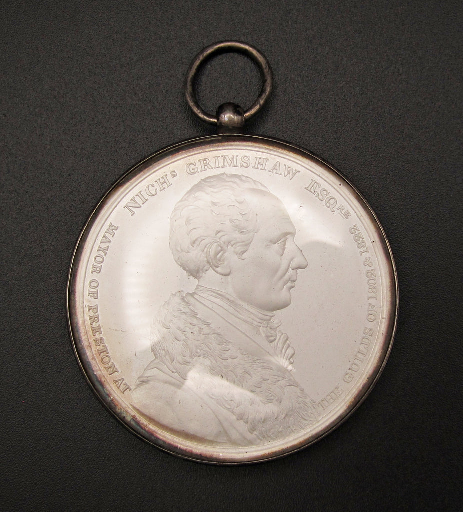 Obverse with bust of Nicholas Grimshaw, mayor of Preston, reverse with conjoined shields.
