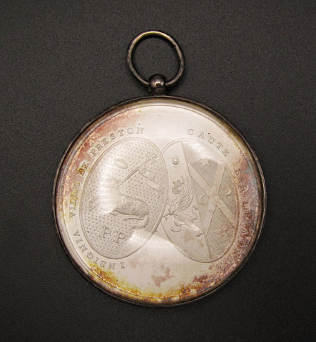 Encased within glass lunettes, silver band around. Frosted mint state with some light toning. Extremely rare and although unsigned, a medal of fantastic workmanship.