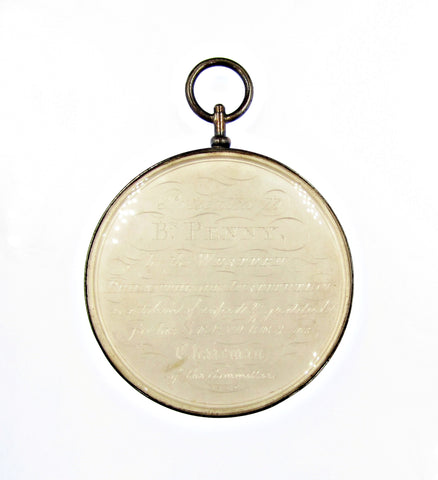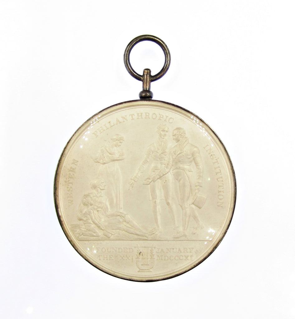 Western Philanthropic Institution silver award medal. Obverse with two men distributing largesse to seated woman with boy, reverse engraved 'Presented to Br Penny - by the Western Philanthropic Institution - as a token of respect & gratitude - for his Services as Chairman of the Committees - 1822'.