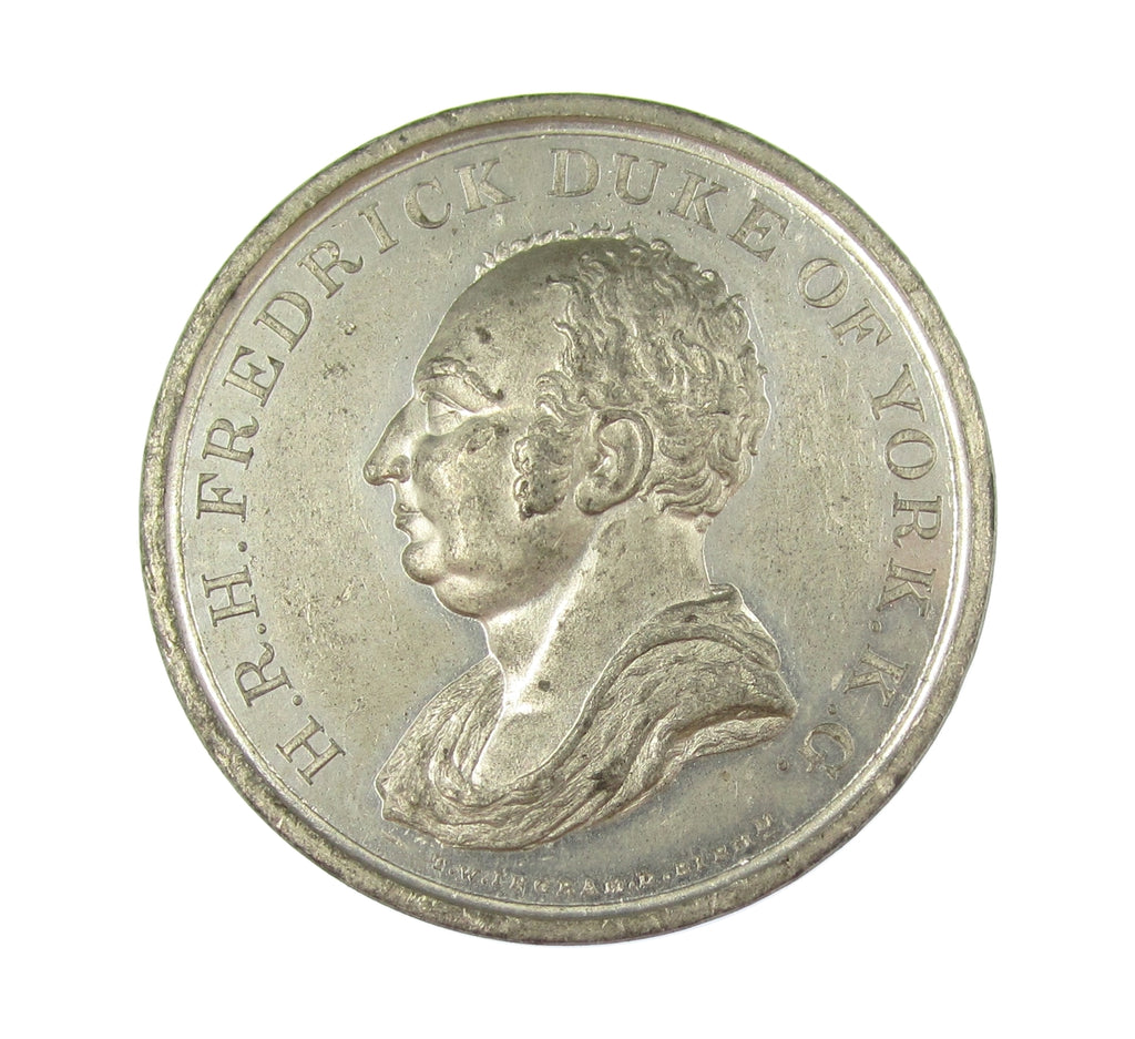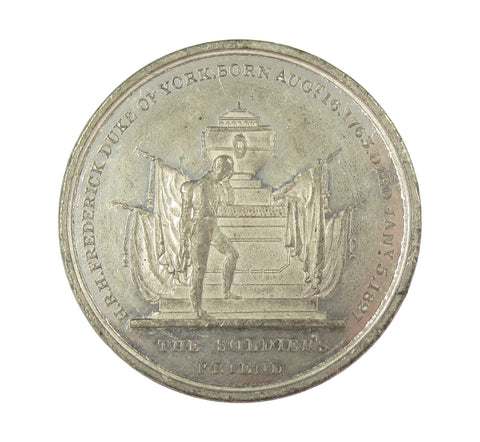 Obverse with draped bust of The Duke of York, reverse with trophy of flags behind funerary urn on plinth and a mourning soldier.