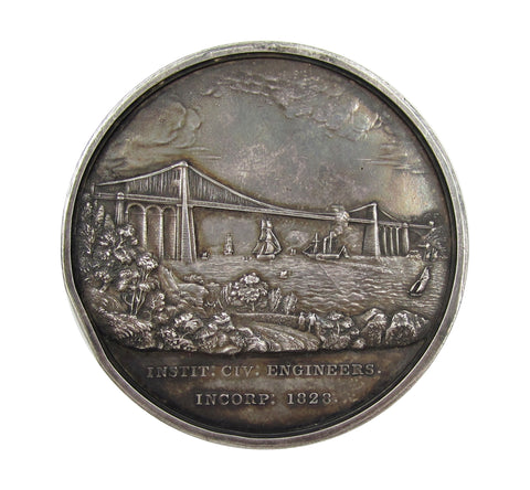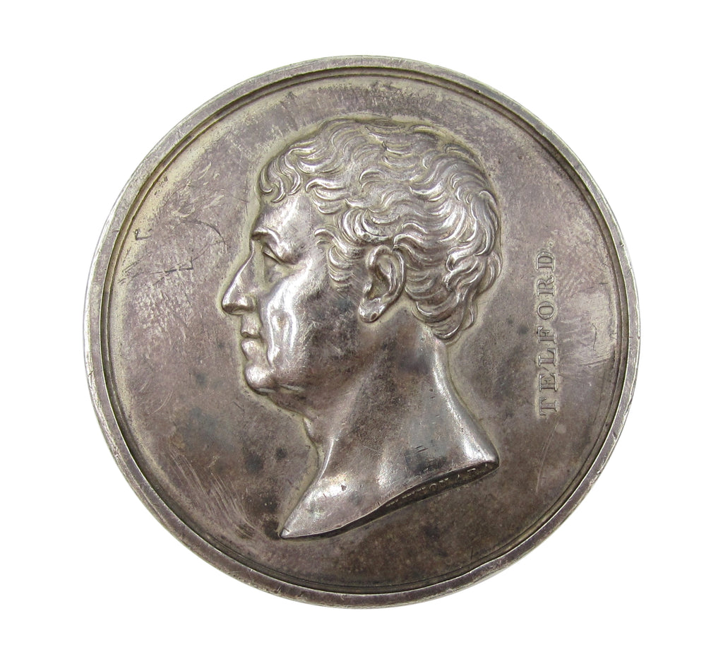 Obverse with bust of Telford, reverse showing view of the Menai suspension bridge. Edge unnamed.
