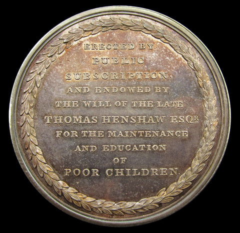 Obverse with view of the school, reverse with legend in ten lines within wreath. Edge reads 'Josh Jones Esqr _ Presented by the Subscribers to the School, 20th April 1829'.