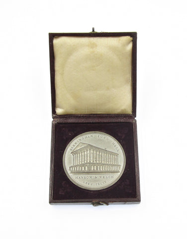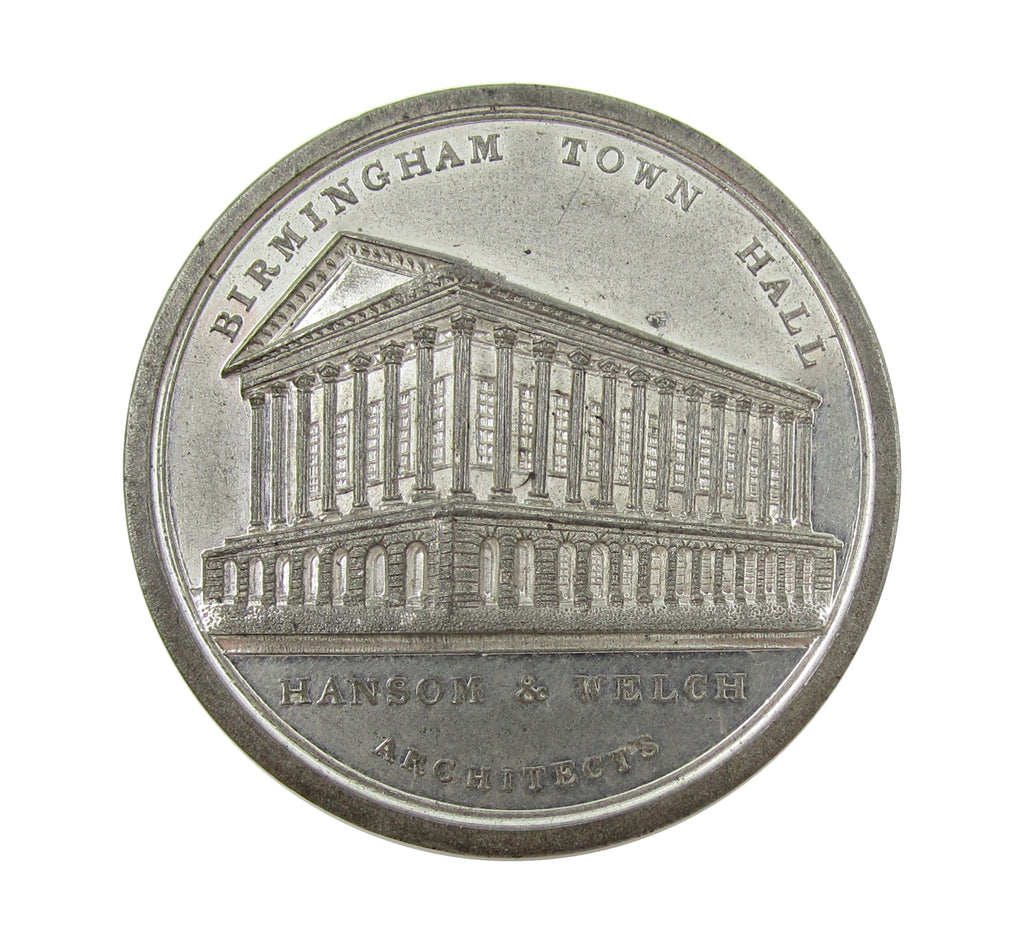 Obverse with view of town hall, 'Hansom & Welch Architects' in exergue. Reverse with 13 line legend with details of the building.
