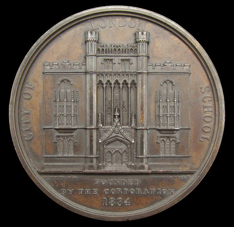 Obverse showing facade of school buildings, reverse with tablet inscribed John Carpenter.