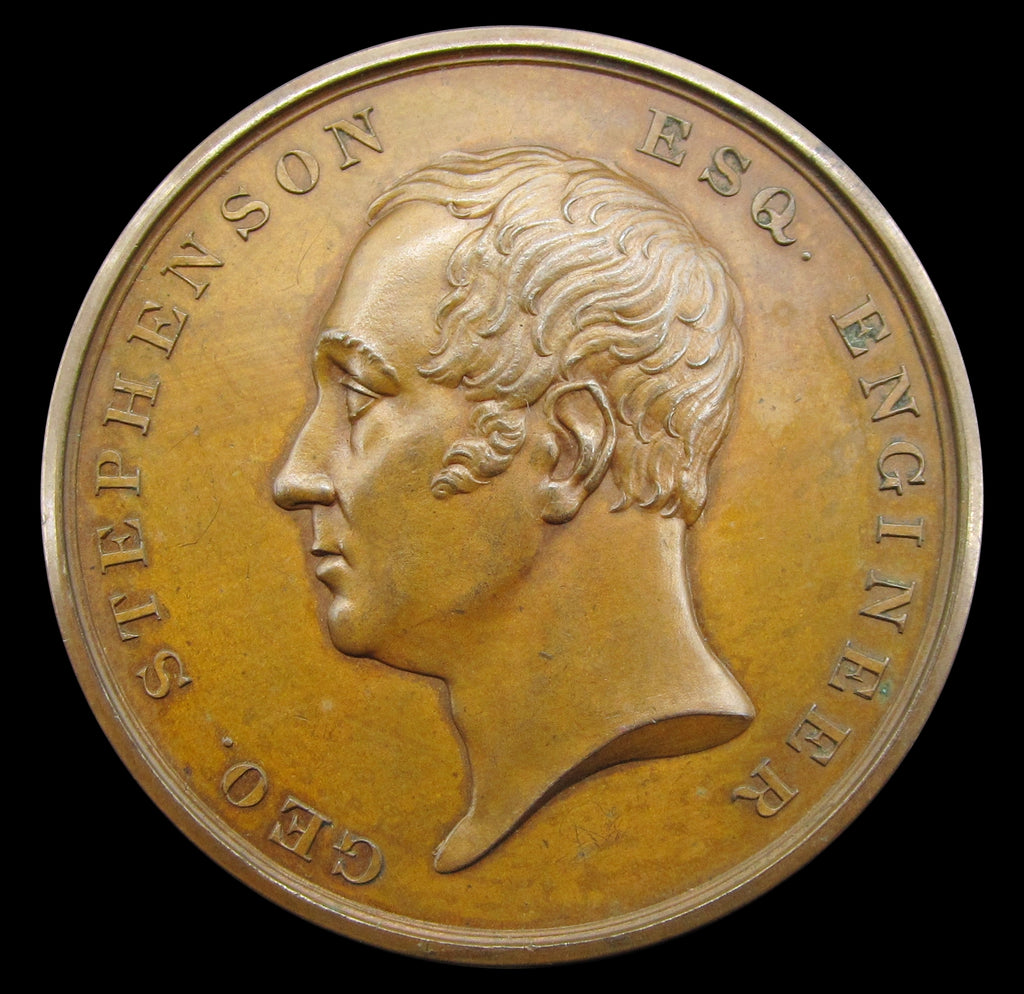 Obverse with bust of the Engineer George Stephenson, reverse showing train crossing viaduct in a landscape.