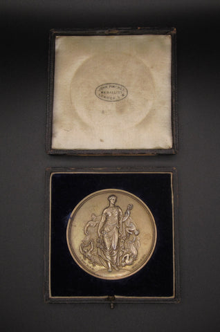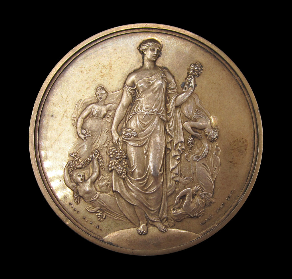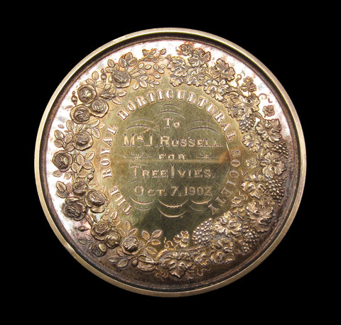 Obverse with Flora standing facing, holding bundles of flowers and attended by four anthousai. Reverse engraved within wreath 'To Mr J Russell For Tree Ivies, Oct 7, 1902'.