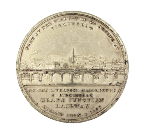 Obverse with facade of the railway station at Liverpool, reverse with view of viaduct leading into Birmingham, with the city beyond.