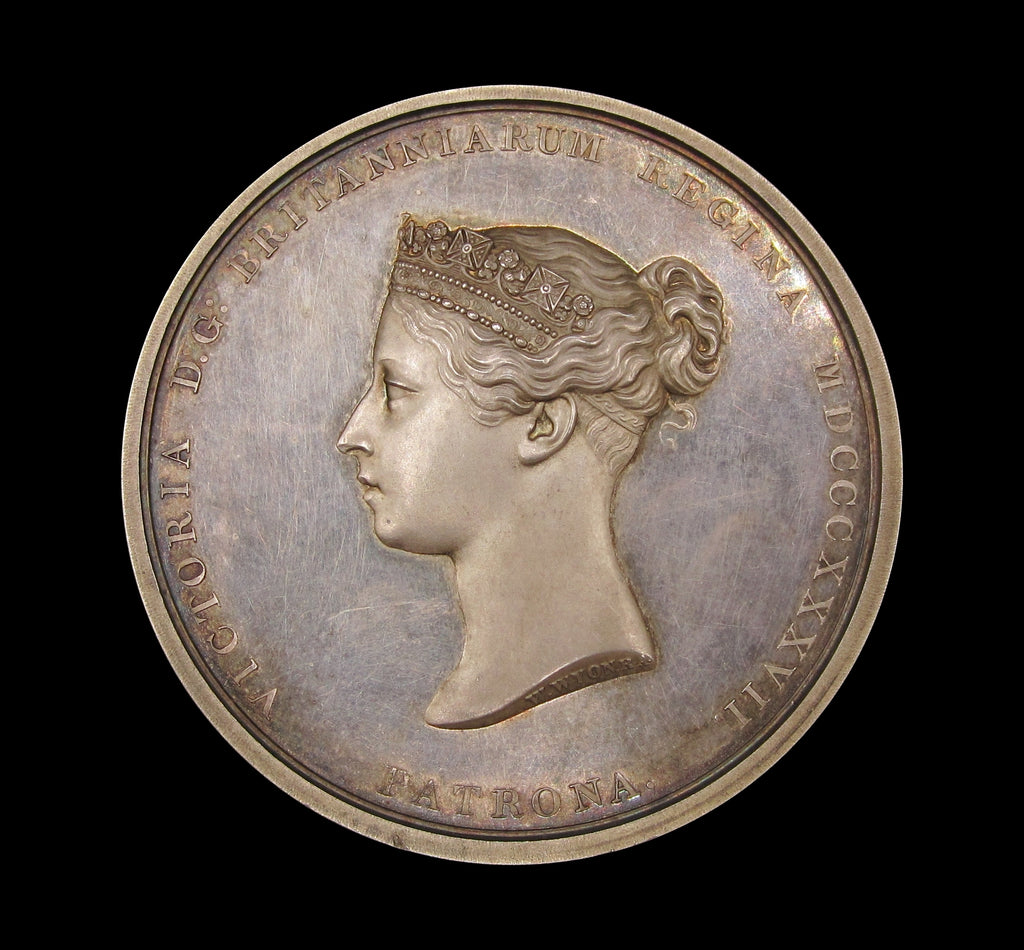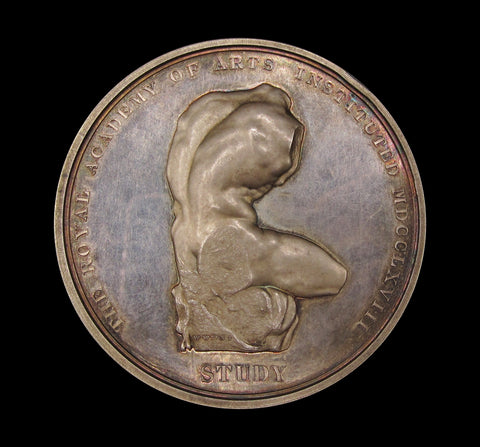 Obverse with the beautiful young head bust of Victoria, reverse with sculpture of a body, mounted on a rock. Edge inscribed 'To E.T Haynes, For The Best Drawing From The Life - 10th Decr 1868'.