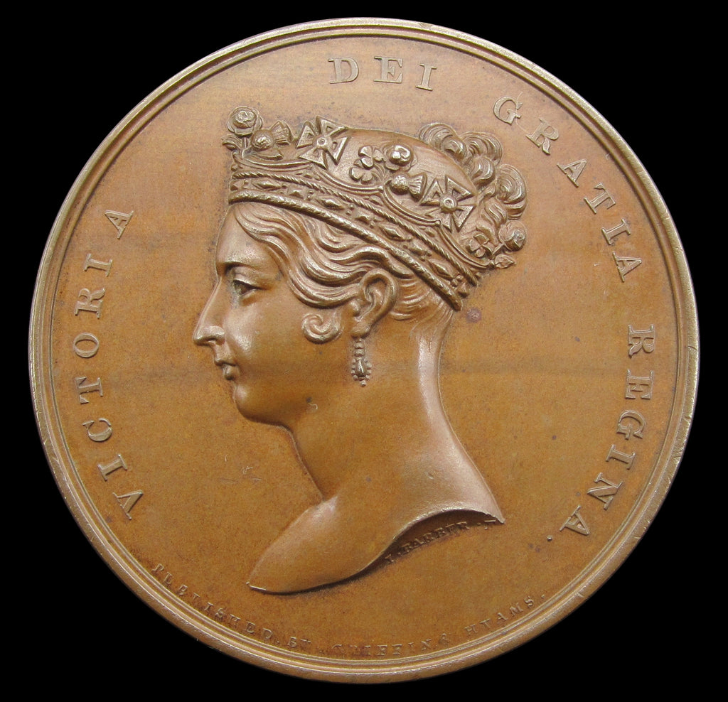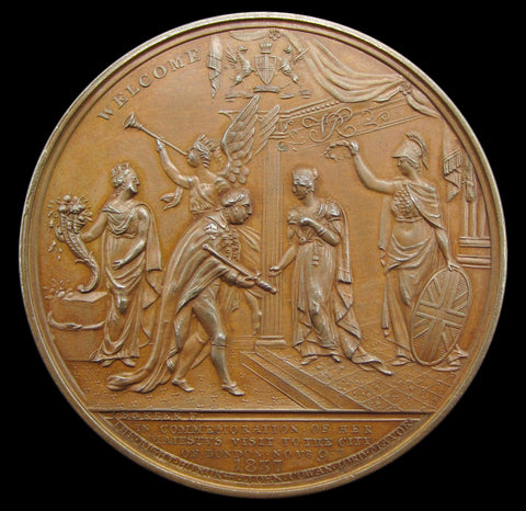 Obverse with young portrait of Victoria, reverse showing Victoria standing beneath a canopy, attended by Britannia, welcomed by the Lord Mayor.