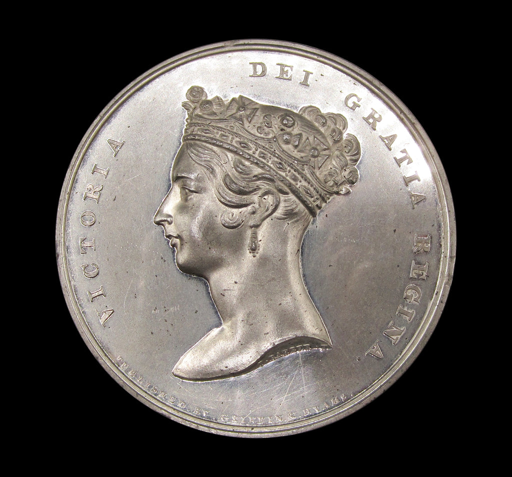 Obverse with young portrait of Victoria, reverse showing Victoria standing beneath a canopy, attended by Britannia, welcomed by the Lord Mayor.