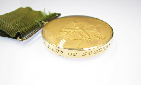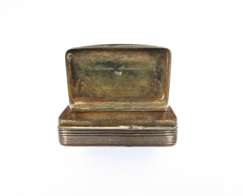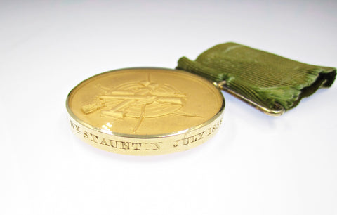 British Longbow Society medal encased within glass lunettes held together by a gold band and engraved on edge with 'W.A Capn of Numbers - Wm Staunton 1838'. The medal is accompanied by a George III silver snuff box, hallmarked to London 1819, the exterior of which is engraved with the initials W.A divided by arrow. The interior panel is further engraved 'Captn of Numbers - William Staunton - July 14 1840'. The snuff box weighs 77 grams.