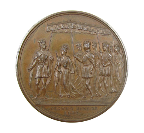 The Queen, holding orb and sceptre, leads a procession beneath a canopy, supported by courtiers.