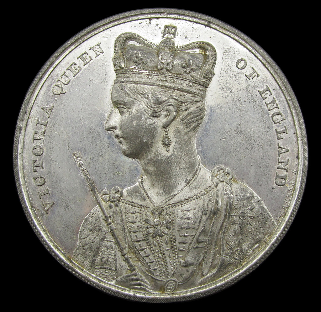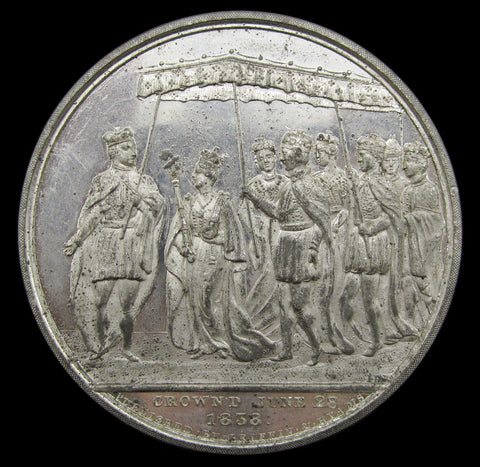 The Queen, holding orb and sceptre, leads a procession beneath a canopy, supported by courtiers.