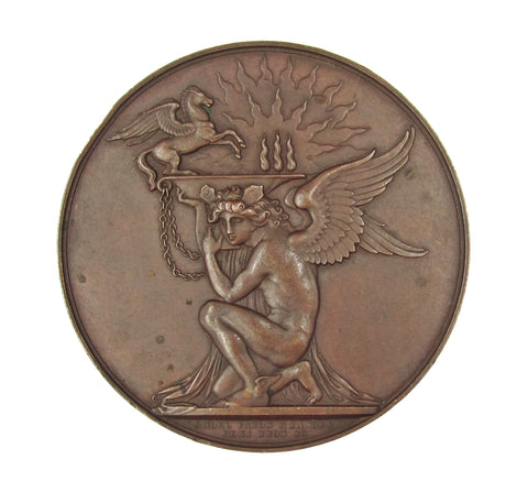 Obverse with a tripod on which rests a laurel branch with legend around, reverse with a kneeling figure of Mercury supporting a lighted lamp, with Pegasus standing on rim. Edge engraved 'Rev John Thompson - Elected Honorary Member MDCCCXXX'.