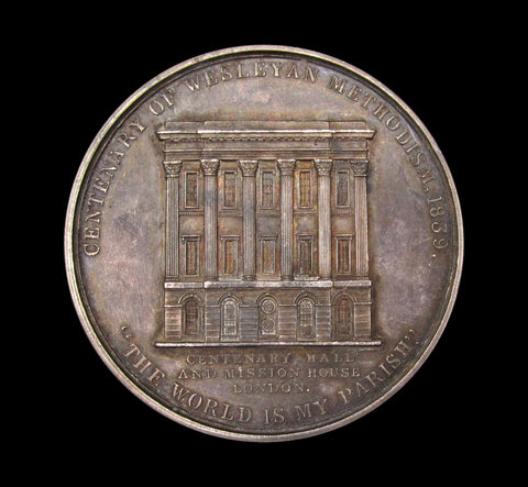 Obverse with bust of Wesley, reverse with facade of building.
