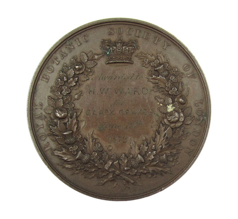 Obverse with a thick cluster of tropical plants, reverse with Royal Botanic Society Of London and awarded to 'H.W Ward, for Black Grapes, June 19th 1872'.