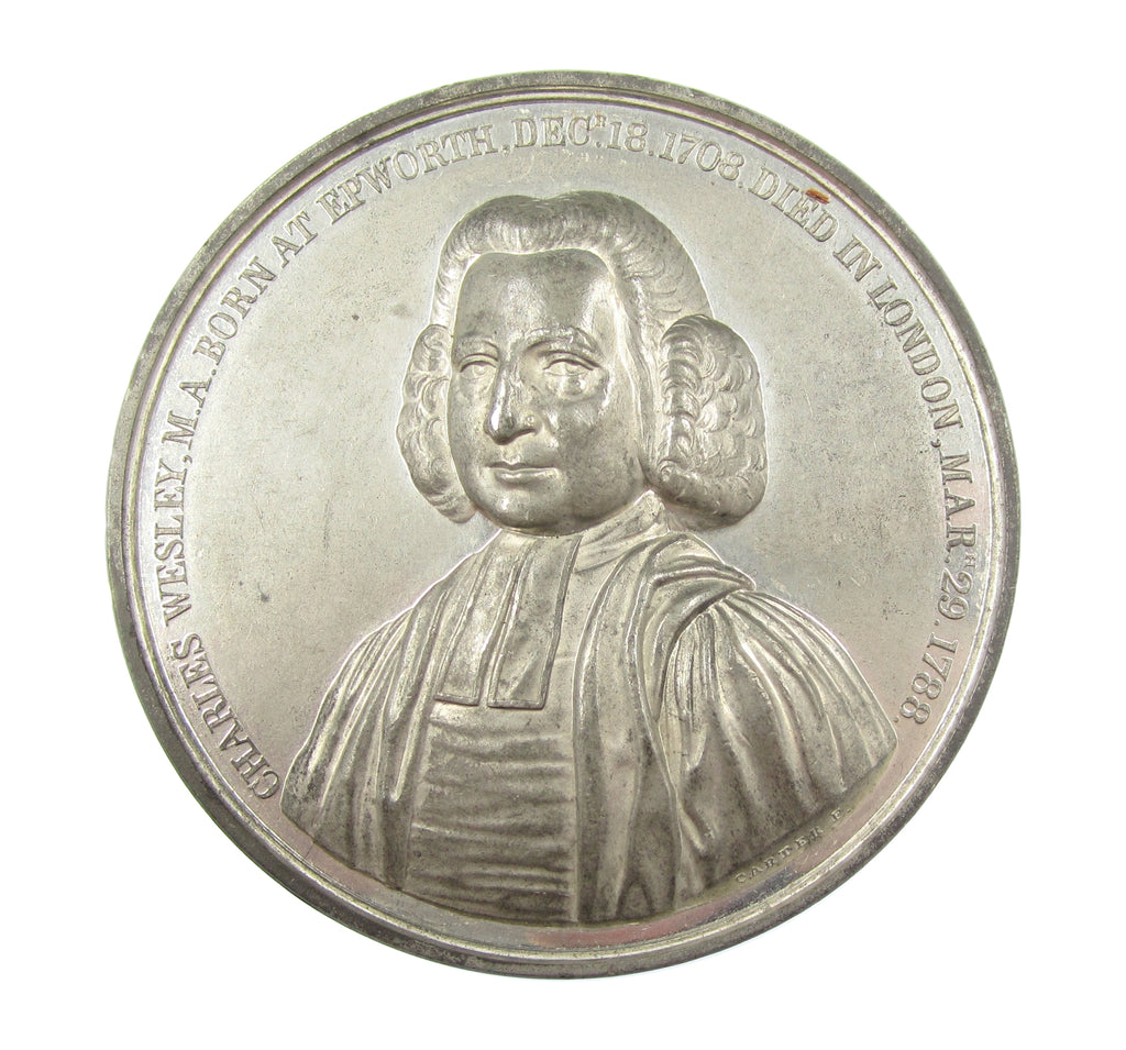 Obverse with bust of Charles Wesley, reverse with 6 line inscription within laurel branches, surrounded by legend.