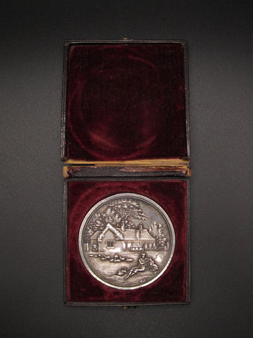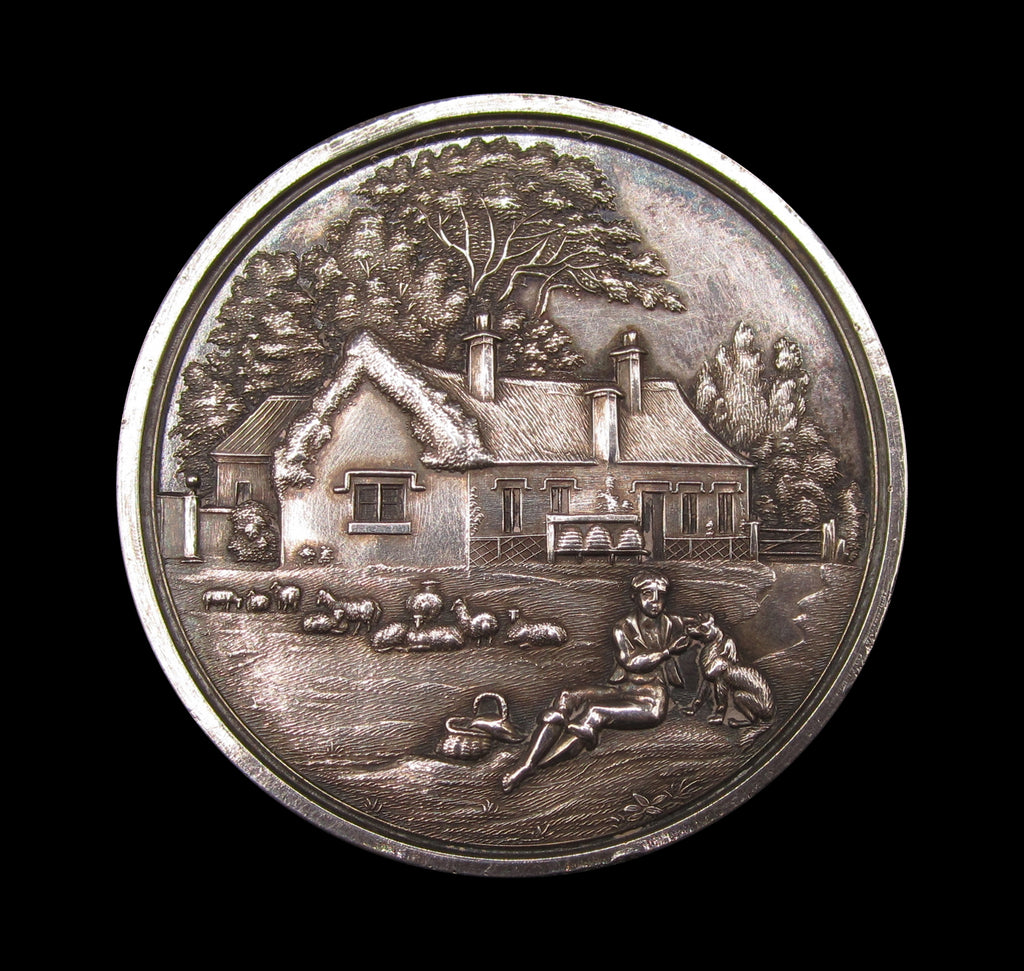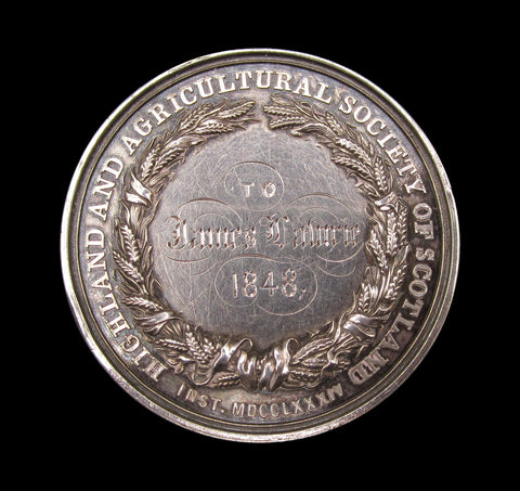 Obverse with traditional country scene, reverse engraved within wreath to James Laurie, 1848. Edge engraved 'For The Best Kept Cottage In The Parish Of Chirnside'.